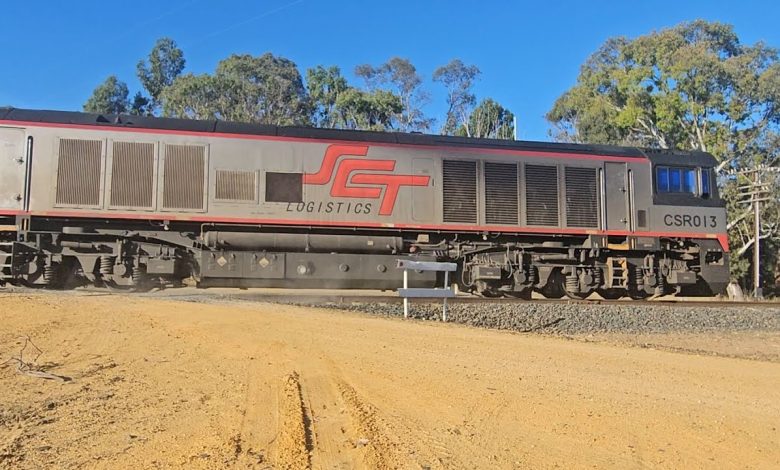 SCT Logistics down “Dark Ghost #1” intermodal freight train service led by CSR013, SCT003, SCT005 & GL102 (RFAM), hauling 8i platform wagon units (boxcars, refrigeration units & containers – no steel).