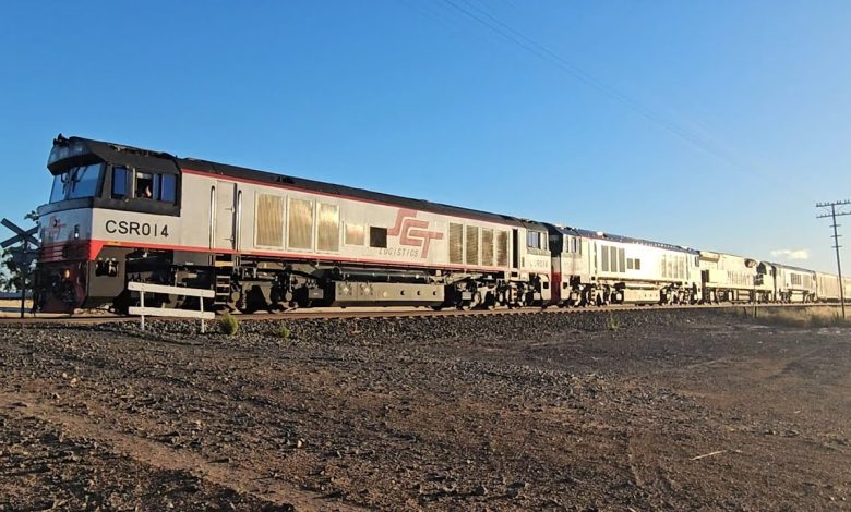 SCT Logistics down “Dark Ghost #1” intermodal and steel freight train service led by CSR014. CSR015, CF4432 (RFAM) & CSR010 (“C. Mobrici”), hauling 95 platform wagon units (boxcars, “butterbox” steel coil containers, Bluescope steel containers, steel slab racks, steel slab tilt-trays, open steel coils, refrigeration units & containers).